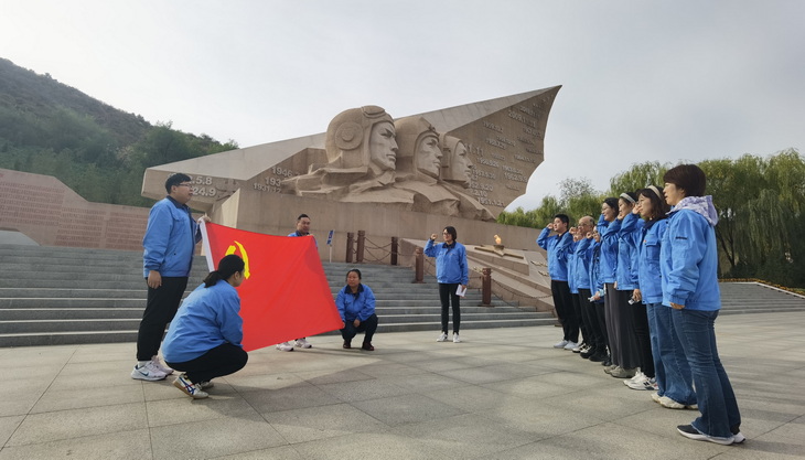 在英雄紀念墻前,國藥工業(yè)第二黨支部組織全體黨員面向黨旗,重溫入黨誓詞,銘刻入黨初心。