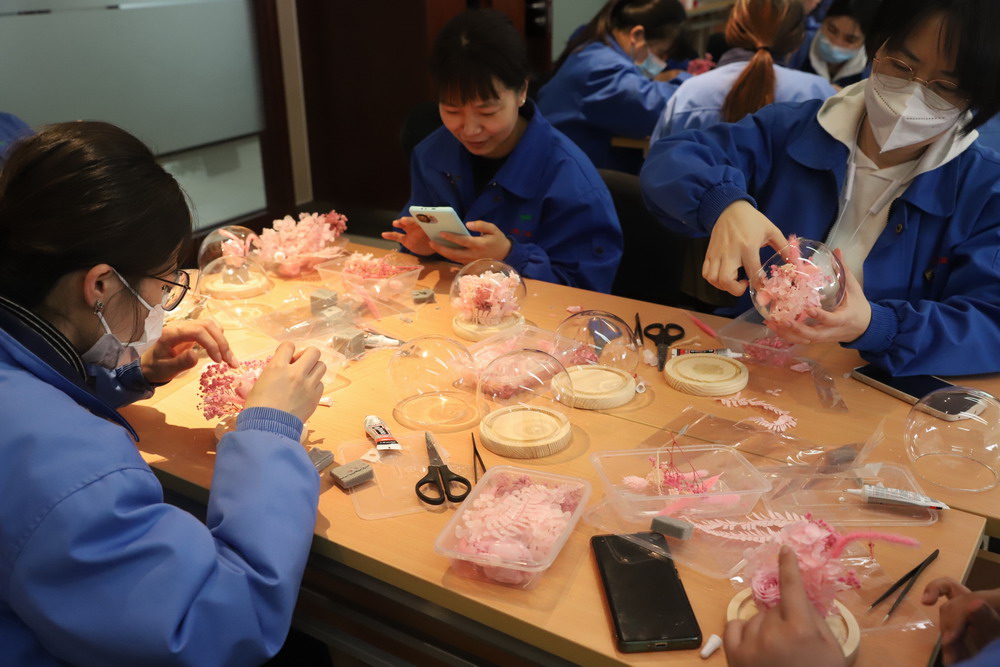 隨后,女同胞們圍坐桌前,熱火朝天地開始DIY永生花制作,從選取花材、規(guī)劃布局、挑選輔材到實際制作,每一個環(huán)節(jié)都精心研究,相互討論,發(fā)揮自己的想象力和創(chuàng)造力,把在工作中培養(yǎng)出來的細(xì)心、專心和耐心等優(yōu)秀品質(zhì),運用到手工制作永生花活動中。大家在現(xiàn)場互相交流、互相建議,在融洽的氣氛中,一朵朵精美的“DIY永生花”作品逐漸完整呈現(xiàn),女同胞們看著自己制作的作品,臉上都露出了燦爛的笑容。