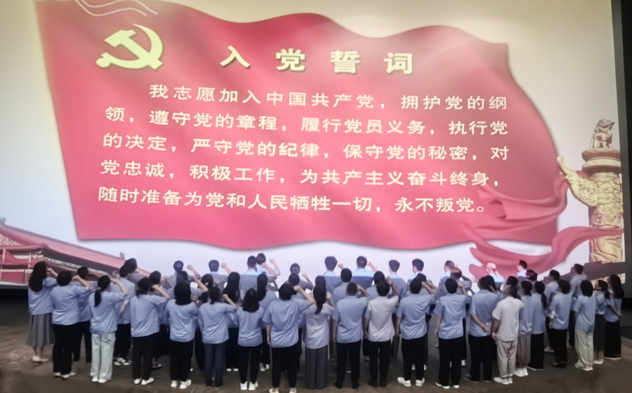 觀影結(jié)束后,在場(chǎng)的黨員、團(tuán)員整齊列隊(duì),面向鮮紅的黨旗,舉起右拳,在領(lǐng)誓人的帶領(lǐng)下莊嚴(yán)宣誓,既是對(duì)革命先輩的深切緬懷,也是對(duì)初心使命的鄭重承諾。每一位黨員都神情肅穆,在重溫誓詞的過(guò)程中,再次感悟入黨時(shí)的赤誠(chéng)與堅(jiān)定,更加明確身為黨員的責(zé)任與使命。